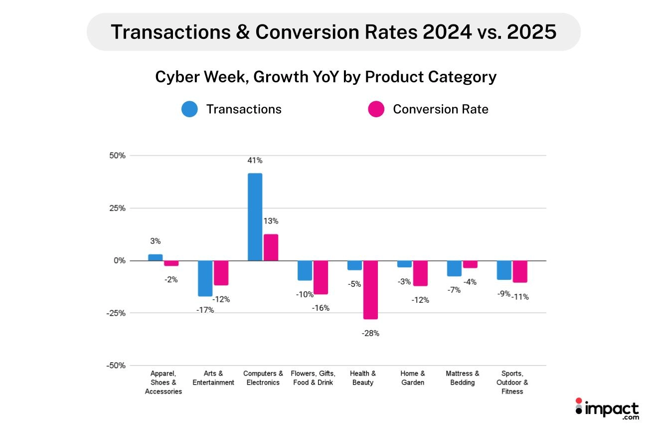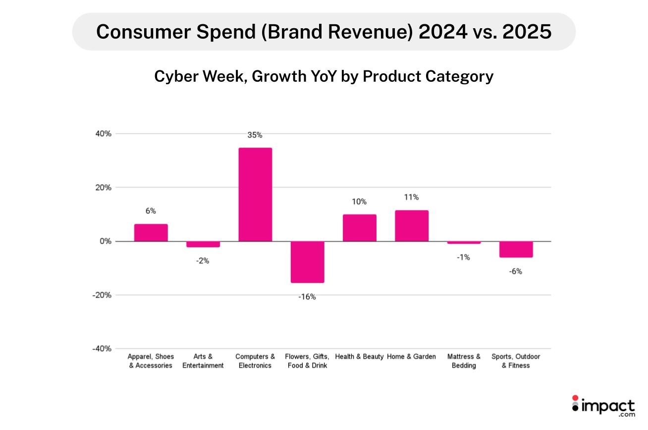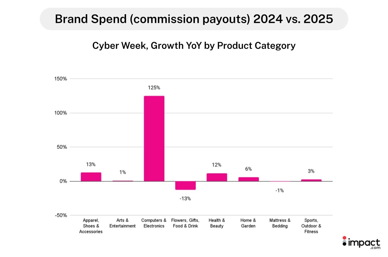The Computers and Electronics category illustrates how this shift played out. Commission payouts rose 125% YoY during Cyber Week, driven by a 41% YoY increase in orders and higher commission rates to partners—likely due to competitive bidding among brands.