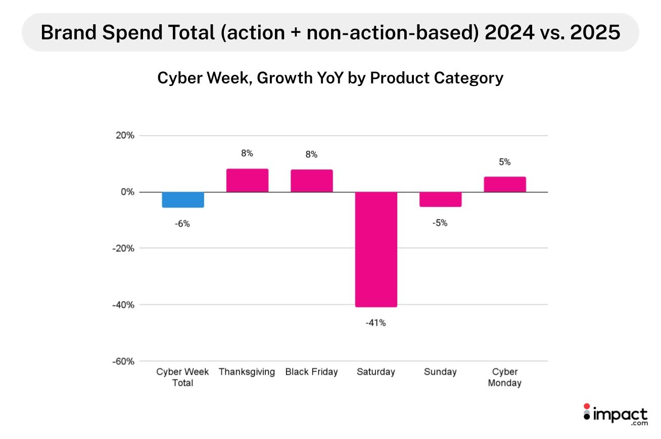 But commission payouts don’t tell the whole story. Total brand spend—which is commissions plus non-performance-based payments such as bonuses and placement fees—actually decreased 3% YoY across the full analysis period and 6% YoY during Cyber Week. This decline was driven by a reduction in non-action payments, which outweighed the rise in commission payouts.