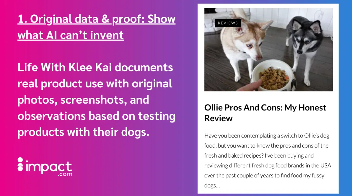 Adding sweat equity and original proof makes affiliate content superior because it introduces information AI can’t invent or infer.