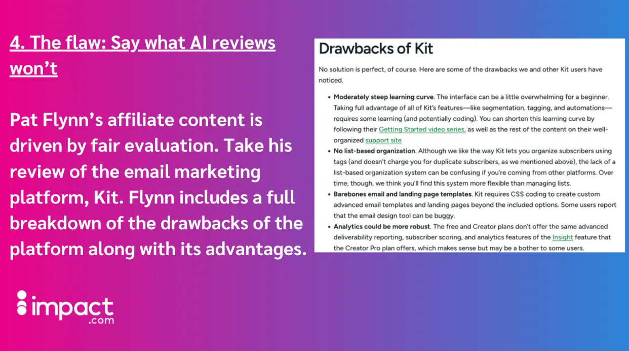 Balanced reviews build trust. Buyers are skeptical of perfection, and AI-generated summaries tend to smooth over flaws. When affiliates clearly explain what a product does well, where it falls short, and who it’s still right for, readers feel more confident making a decision.