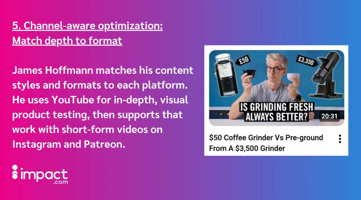 James Hoffmann is an affiliate who matches content format to each platform strategically. He uses YouTube for in-depth, visual product testing of coffee equipment: 20+ minute reviews showing grind quality, extraction, and real-world use.