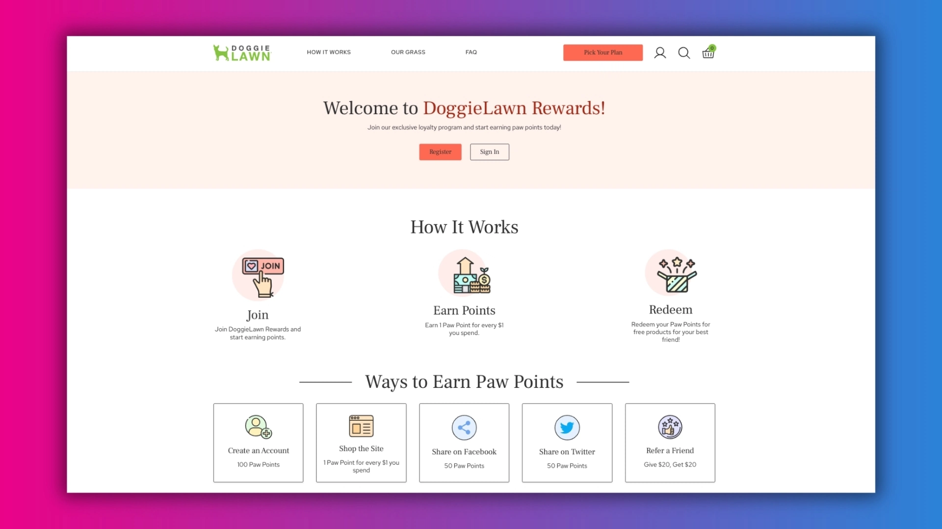 DoggieLawn’s reward system that provides customers discounts in exchange for different promotion activities.