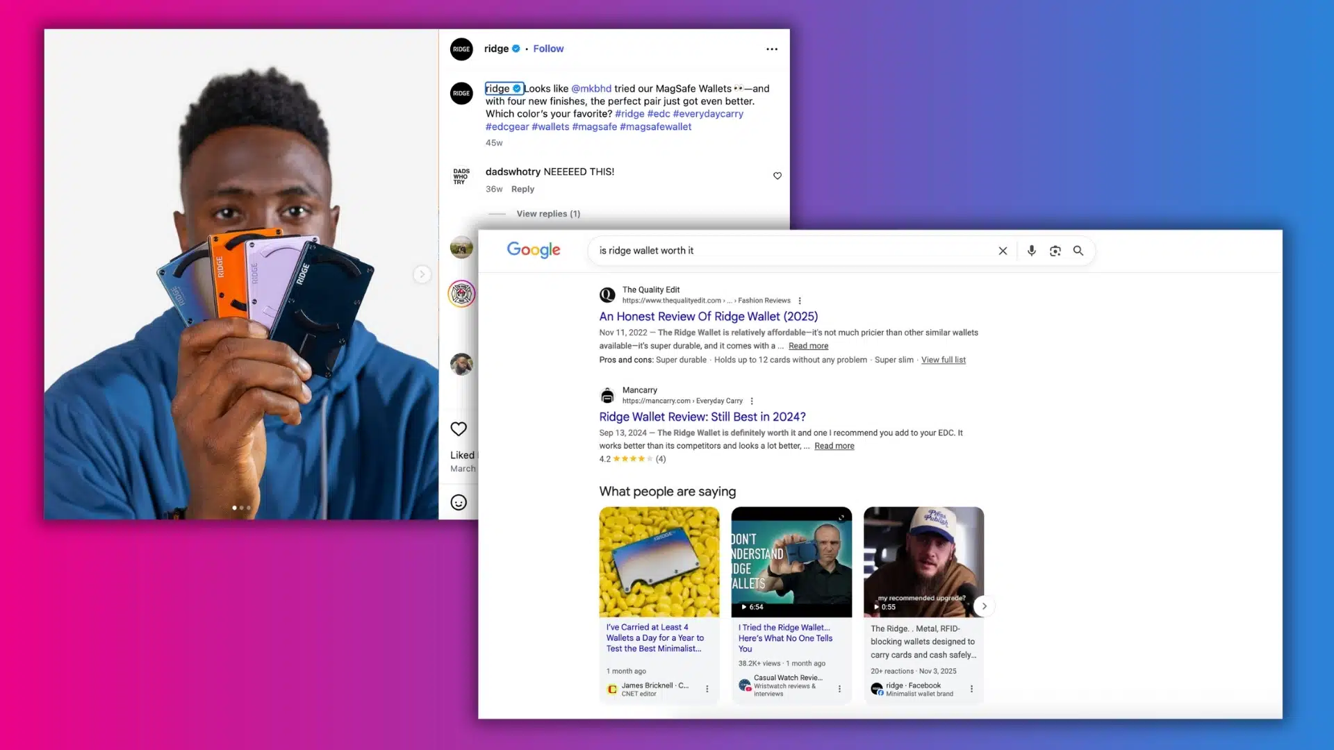 Ridge’s comprehensive search strategy allows viewers intrigued by tech influencer Marques Brownlee’s wallet review to find answers to follow-up questions through search.